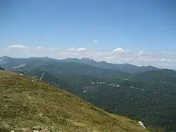 The region is a part of the Dinaric Alps, linked to a Late Jurassic to recent times fold and thrust belt, itself part of the Alpine orogeny, extending southeast from the southern Alps.[13] The Dinaric Alps in Croatia encompass the entire Gorski Kotar and Lika regions, as well as considerable parts of Dalmatia, with their northeastern edge running from 1,181-metre (3,875 ft) Žumberak to the Banovina region, along the Sava River,[12] and their westernmost landforms being 1,272-metre (4,173 ft) Ćićarija and 1,396-metre (4,580 ft) Učka mountains in Istria. The Mountainous Croatia contains five out of eight mountains in Croatia higher than 1,500 metres (4,900 feet): Velebit, Plješivica, Velika Kapela, Risnjak and Snježnik.[18] Karst topography makes up about half of Croatia and is especially prominent in the Dinaric Alps and in turn, the Mountainous Croatia.[14] There are numerous caves in the Mountainous Croatia.[19] The longest cave in Croatia and in the entire Dinaric Alps, 20,656-metre (67,769 ft) Kita Gaćešina, is located in southern Velebit area of the Mountainous Croatia.[20]