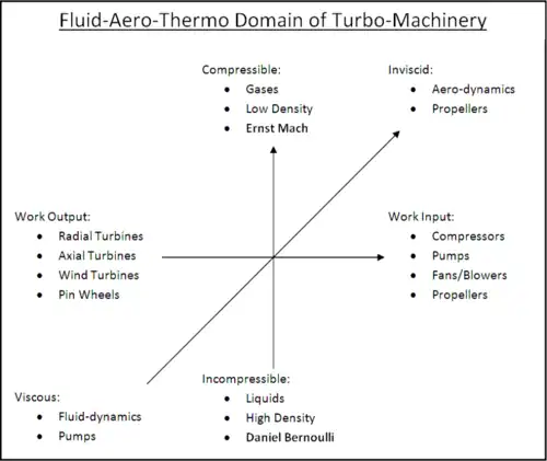 Figure 2.1 (shown right) represents the aero-thermo domain of turbomachinery. The horizontal axis represents the energy equation derivable from The first law of thermodynamics.[1][14] The vertical axis, which can be characterized by Mach Number, represents the range of fluid compressibility (or elasticity).[1][14] The Z-axis, which can be characterized by Reynolds number, represents the range of fluid viscosities (or stickiness).[14] Mathematicians and physicists who established the foundations of this aero-thermo domain include:[15][16] Isaac Newton, Daniel Bernoulli, Leonhard Euler, Claude-Louis Navier, George Stokes, Ernst Mach, Nikolay Yegorovich Zhukovsky, Martin Kutta, Ludwig Prandtl, Theodore von Kármán, Paul Richard Heinrich Blasius, and Henri Coandă.