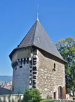 The vaulted second floor of the tower had its keystones decorated with the Savoie coat of arms and those of Dukes Louis I of Savoie, Amédée IX of Savoie, and Philibert II of Savoie. Above, the large attic space is encircled by crenellated machicolations pierced by archways. A square stair turret flanks and dominates the tower, serving as a lookout and complemented by a watchtower at the top, rebuilt in 1875. The tower is lit by iron-grilled windows. In the 16th century, it was used as a prison, and in 1726 the archives, originally housed in the Trésorerie tower, were moved here. Repairs were carried out in 1823 and 1861.[23]