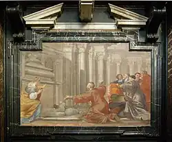 The Opening of the Coffin of St. Casimir measures 285 by 402 centimetres (112 in × 158 in) and decorates the east wall. It depicts the opening of St. Casimir's coffin on August 16, 1604 during his canonization proceedings. The body in the coffin was found intact, 120 years after the burial. The saint is wearing a long red robe, decorated with stoat fur, and a ducal crown. Bishop Benedykt Woyna, who wrote to Rome of a wonderful smell after the lid was lifted, has his hands raised to heaven in praise of the Lord.[2] Kneeling at the head of the saint is Gregorius Swiecicki, the canon at Vilnius Cathedral chapter, who was entrusted with Casimir's canonization process. Jan Kazimierz Sapieha who commissioned the painting stands on the right; Virgin Mary and Saint Peter, dressed in clothes of the time, stand on the left. Around them are priests with long candles in their hands.[2]