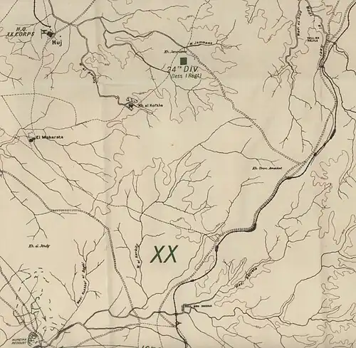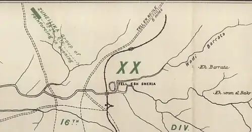 A reconnaissance of the Ottoman positions at Sheria, was carried out by the 181st Brigade (60th Division), with a view to crossing the wadi at two places to capture the high ground stretching from Barrata to the railway.[22] The commander of a machine gun section of the 180th Machine Gun Company, describes coming under heavy fire at about 04:00.[23] "Walk across the open under shell, m.g. and rifle fire ... [the] battle of Machine Guns v. Machine Guns, depend[ing] entirely on the coolness of each individual gunner."[24] Meanwhile, the 74th (Yeomanry) Division took up a position on the right of the 60th (London) Division. The 230th Brigade (74th Division) was ordered not to advance across the Wadi esh Sheria, nor extend their right to the Kh. Barrata, until touch with the 60th (London) Division could be established. As touch could not be established, they remained in position during the night.[25]