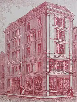 From 1884 the firm traded as Charles Frodsham & Co., becoming incorporated in 1893, and moving to new premises at 115 New Bond Street in 1895. A new branch specializing in motor accessories was opened in nearby Dering Street in 1911, to sell speedometers and car clocks. The main business moved again in 1914 to 27 South Molton Street, London, where it remained until considerable damage caused by an air raid in 1941 forced a move to 62 Beauchamp Place.