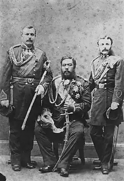 After Lunalilo's death and the monarchical election of 1874 that followed, Judd openly supported Queen Dowager Emma's candidacy for the throne against Kalākaua but switched sides after Kalākaua's victory over Emma in the legislative vote, which gained him the distrust of the king's sister Liliuokalani.[11] During the reign of Kalākaua, in 1874, Judd was reappointed to the King's Staff as a colonel.[6] Kalākaua also appointed Judd to serve on his Privy Council of State, the monarch's advisory council. On September 8, 1879, he was appointed a member of the House of Nobles, the upper house of the legislature, and served in this legislative post during the session from 1880 to 1886. He also served as Commissioner of Crown Lands from 1878 and member of the Board of Health from 1880.[6][12] On July 6, 1878, he was appointed the King's Chamberlain and served as his private secretary.[6] Edward William Purvis served as his vice-chamberlain.[13]