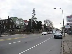 After several blocks of row houses, Cheltenham Avenue hits Oxford Circle, a major intersection of the Roosevelt Boulevard (which carries US 1 and US 13), Oxford Avenue (PA 232), and Castor Avenue. It then continues through more row houses and passes to the northeast of Frankford Transportation Center, a major SEPTA stop and terminal for the Market-Frankford Line.