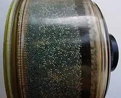 Capturing noxious gases may be accomplished by sorbents.[4] These materials (activated carbon, aluminium oxide, zeolite, etc.) have a large specific surface area and can absorb many gases. Typically, such sorbents are in the form of granules and fill the cartridge. Contaminated air travels through the cartridge's bed of sorbent granules. Movable harmful gas molecules collide with the surface of the sorbent and remain therein. The sorbent gradually saturates and loses its ability to capture pollutants. The bond strength between captured molecules and the sorbent is small, and molecules can separate from the sorbent and return to the air. The sorbent's ability to capture gases depends on the properties of the gases and their concentrations, including air temperature and relative humidity.[5]
