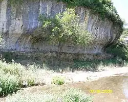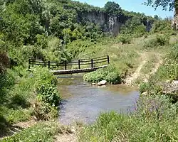 The Chernyalka takes its source in the Danubian Plain at an altitude of 425 m, some 1.5 km northwest of the village of Lisets. It flows north to the village of Ralevo and then bends in direction northwest, flowing through a karst gorge with steep, at places vertical slopes. The river cuts through the southernmost parts of the Pleven Heights, built of Upper Cretaceous limestones and clay–sandy rocks. The section between the villages of Gortalovo and Kurtozhabene is particularly picturesque. In 1969, the entire length of the 28 km gorge with an area of 4.492 km2 was declared a natural landmark.[2] The river flows into the Vit at an altitude of 66 m at the village of Tarnene.[1]
