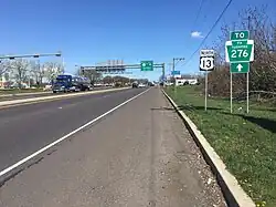 Following this intersection, the route enters the borough of Bristol and widens into a four-lane divided highway with multiple intersections controlled by jughandles, heading northeast through business areas further from the railroad tracks and crossing Mill Creek. The road briefly passes through Bristol Township as it heads south of Silver Lake and curves northeast. US 13 continues through the northern part of the borough of Bristol, running through commercial areas and passing to the west of residential neighborhoods. The route reenters Bristol Township upon crossing Adams Hollow Creek and passes through commercial areas with some woods before coming to an intersection with a ramp that provides access to the Pennsylvania Turnpike (I-95) at an interchange. Past this ramp, the road passes through commercial areas and crosses an East Penn Railroad line at-grade before passing under the Delaware River–Turnpike Toll Bridge which carries I-95 over the Delaware River. US 13 crosses the Delaware Canal and runs past more businesses. The route crosses into the borough of Tullytown and passes between the Levittown Town Center shopping center to the west and Levittown station serving SEPTA's Trenton Line on the adjacent Northeast Corridor to the east.[2][5]