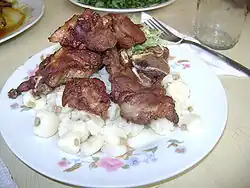 Mofongo is a popular dish in which green plantains, cassava, or breadfruit are fried then mashed with chicharrón and other ingredients. Chuleta kan-kan is found in Puerto Rican fondas, using a pork chop (chuleta) with rib, fat, and skin still attached, then marinated. Chuleta kan-kan is deep-fried, forming chicharrónes of crispy skin attached to the rib and pork-chop meat. The city of Bayamón – nicknamed the "city of chicharrón" – is famous for the chicharrón produced locally, as is the Guavate barrio in the city of Cayey.[9] Chicharrón is a popular ingredient in Puerto Rican rice with added sofrito, pigeon peas, spices and other ingredients. Rusiao de yuca like pasteles are made from grated cassava that has been dehydrated, toasted, then notably rehydrated with coconut milk into masa and seasoned with anise, mashed or finely chopped chicharrón, oregano among other ingredients. They are then wrapped in banana leaf and grilled.