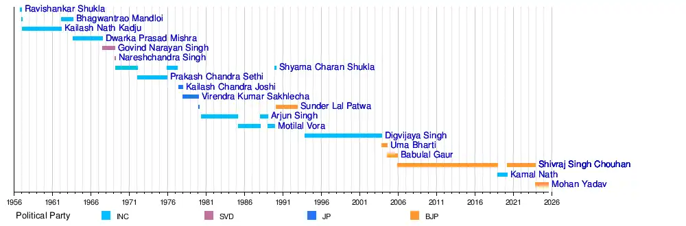 Following Madhya Pradesh's reorganisation on 1 November 1999, 19 people have served as its chief minister. Twelve of these belonged to the Indian National Congress, including the inaugural officeholder Ravishankar Shukla. The first non-Congress chief minister was Govind Narayan Singh who defected from the party and lead a Samyukta Vidhayak Dal government from 1967 to 1969. Digvijaya Singh of the Congress became the first officeholder to serve two full five-year terms. He was succeeded by Uma Bharti of the Bharatiya Janata Party, Madhya Pradesh's only woman chief minister. Shivraj Singh Chouhan of the Bharatiya Janata Party was the longest-serving chief minister of the state, serving for over 16 and half years. Chouhan was succeeded by Dr. Mohan Yadav of his own party after the 2023 elections, which was seen as a landslide victory[2] for the BJP.