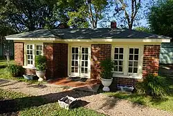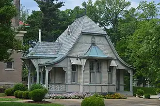 The original was built for Wendy Darling in J. M. Barrie's play, Peter Pan, or The Boy Who Wouldn't Grow Up. Wendy was shot by the Lost Boy Tootles after arriving in Neverland, so Peter Pan and the Lost Boys built a small house around her where she had fallen. It was inspired by the wash-house behind Barrie's childhood home in Kirriemuir[1] and first appeared in story form in The Little White Bird in which fairies build a house around Mamie Mannering—the prototype for Wendy—so protecting her from the cold.[2]