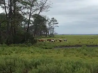 The refuge is home to Virginia's herd of approximately 150 Chincoteague ponies, which grazes within a large fenced area. In late July each year, members of the Chincoteague Volunteer Fire Company—which owns the ponies—who have experience in horse wrangling round up the herd and corral them.[3] On the final Wednesday before the final Thursday of each July, at slack tide, the ponies swim the channel between Assateague Island and Chincoteague Island, where the herd is moved to a coral at Chincoteague's carnival grounds ahead of a foal auction, which keeps the herd's size in check. The event sees Chincoteague's population increase tenfold for the event and people often gather to view the swim hours in advance. After the auction, the ponies return to the refuge.[3]