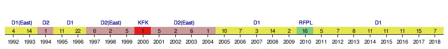 Season Div. Pos. Pl. W D L GS GA P Cup Europe Top Scorer (League) Head Coach 1992 2nd, "East" 4 30 15 6 9 48 38 36