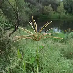 This is a perennial grass which can reach one half to nearly three meters in height and spreads via stolons. It forms tufts and can spread into wide monotypic stands. The inflorescence is a single or double whorl of fingerlike racemes up to 15 centimeters long. Each spikelet in the raceme is a few millimeters long and contains one or two fertile florets and up to four sterile florets.