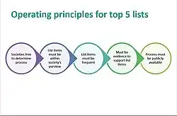 List items recommend practices to be avoided and typically begin with the word "Don't" or "Avoid"; for example, one of the recommendations released in the first wave of the campaign was Don't order screening chest X-rays and ECGs for asymptomatic or low risk outpatients.[20] National specialty societies are free to determine the process for generating their lists, as long as they are done in accordance with the following principles:[1]