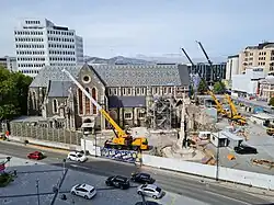 Earthquakes have repeatedly damaged the building (mostly the spire): in 1881, 1888, 1901, 1922, and 2010. The February 2011 Christchurch earthquake destroyed the spire and the upper portion of the tower, and severely damaged the rest of the building. A lower portion of the tower was demolished immediately following the 2011 earthquake to facilitate search and rescue operations. The remainder of the tower was demolished in March 2012. The badly damaged west wall, which contained the rose window, partially collapsed in the June 2011 earthquake and suffered further damage in the December 2011 earthquakes.[3] The Anglican Church decided to demolish the building and replace it with a new structure, but various groups opposed the church's intentions, with actions including taking a case to court. While the judgements were mostly in favour of the church, no further demolition occurred after the removal of the tower in early 2012. Government expressed its concern over the stalemate and appointed an independent negotiator and in September 2017, the Christchurch Diocesan Synod announced that ChristChurch Cathedral will be reinstated[4] after promises of extra grants and loans from local and central government.[5] By mid-2019 early design and stabilisation work had begun.[6]