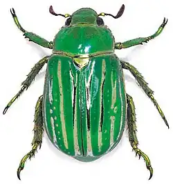 The adult beetles are 20 to 30 millimetres (0.8–1.2 in) long,[4][5] and are bright green with silver stripes on the elytra (red and purple color forms occur but are very rare).[1] These iridescent stripes on the cuticle of the elytra are a result of cholesteric liquid crystal organization of chitin molecules.[6] The differences in color are a result of the microscopic structure of each section, with green reflected from cusp-like structures and silver reflected from flat layers parallel to the surface of the elytra.[7] As established through Mueller matrix spectroscopic ellipsometry,[8][9] the optical properties change with the incidence angle of the propagating light. The polygonal cells in the green stripes generate self-healing Bessel beams.[10]