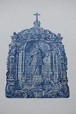 Over the arches are allegorical figures: Preserverance, Liberty and Poverty, Chastity and Obedience, Piety and Patience, Awe of God and Understanding, and Humility.[1][2] The tiles that cover the cupola following architectural designs with perspectives. Over the window is an inscription: "POLICARPO DE / OLIVEIRA BERN. / PINTOU ESTA OBRA DE AZU / LEIO" (Policarpo de Oliveira Bern. Painted this work of azulejo); in the centre of the vaulted nave is Lawrence in glory, accompanied by angels to his rest, and the caption: "FEITO / NO ANNO DE 1730 / SENDO VIGÁRIO GERAL O R.DO D.TOR M.EL DE SOUZA / TEIXEIRA / JUIS DOSTO" (Done in the year 1730, being the Vicar-General Ricardo Tormel de Sousa Teixeira judge).[1][2][4] The extensive azulejo has resulted in it being referred to as the Igreja de Louça (Church of China).[2][5] In the sacristy sillar are azulejo tiles, with bar and panels in flowering vases. In the nave's papal altar, there are two niches; the chancel with altar marble stone from Alicante and gilded altarpiece.[1] The baptismal fonte is also constructed of Alicante stone.[1]