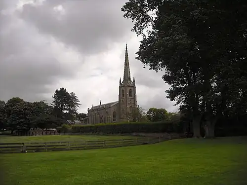 The church is built in sandstone ashlar with slate roofs. Its plan consists of a six-bay nave without aisles, a three-bay chancel with aisles which are now used as vestries. To the north and south gabled porches project slightly from the second bays from west. The other bays have lancet windows between gabled buttresses. The nave is in Early English style and the chancel is in Decorated style.[3] The steeple is in Perpendicular style.[12] It has angle buttresses and is in four stages. The parapet is embattled and pinnacles rise from the corners. The octagonal spire is recessed and rises to a height of 150 feet (46 m). It is crocketed, has three tiers of two-light lucarnes and is supported by four flying buttresses.[3] The authors of the Buildings of England series consider it to be "perhaps the finest work of Edmund Sharpe".[10]