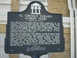 El Circulo Cubano can trace its history back to an earlier organization called El Club Nacional Cubano which was founded October 10, 1899.[3] The organization changed its name to El Círculo Cubano in 1902 with the goal of a being a fraternal organization of Cubans in Tampa and to assist each other and help with medical care like other mutual aid societies in the city.[3] The first building was completed in 1908 and was located on 10th Avenue and 14th Street and was a two-story, redbrick building and featured a veranda and looked like many other buildings on East 7th Avenue.[4] It was destroyed in a fire in 1916. At the time of the fire the Cuban Club had about 2,600 members and they contributed towards creating a larger and more permanent structure.[5] Many young Cuban men were attracted to the Cuban Club since they heavily promoted athletics and had a boxing ring and a gym behind the club building.[5] Membership numbers heavily fluctuated throughout the years.[6]