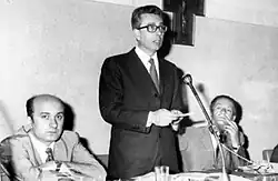 As a young man, De Mita joined the Christian Democracy (DC) and entered politics.[4] In 1953, De Mita was among the proponents of "La Base", a leftist wing of the party, close to Giovanni Marcora.[3][5] He rose through the ranks of the party, becoming a member of its national council in 1956 during the party's congress in Trento.[6]