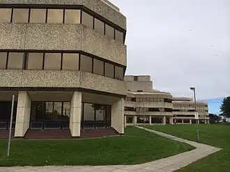Swansea Civic Centre (Welsh: Canolfan Ddinesig Abertawe) – formerly known as County Hall – is the principal administrative centre of Swansea Council. Standing some 800 m southwest of Swansea city centre, by the seafront and overlooking Swansea Bay, the complex houses – in addition to the council chamber and offices – a public cafe, the central library, an exhibition space, archives service, and contact centre.