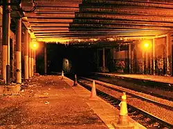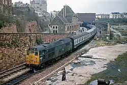 In 1923, grouping resulted in the Midland Railway being absorbed into the London, Midland and Scottish Railway (LMS), and the line continued in a joint arrangement between the Great Western and the LMS.[2] From 1924, many trains to Avonmouth were extended to Severn Beach, a growing seaside resort, and some on to Pilning, then back to Temple Meads via Patchway.[4][3] Between 1903 and 1930 the station employed an average of 22 staff, and in 1926 the station master assumed control over Montpelier as well. The platform canopies were partially removed in the 1930s, and bomb-damage during the Bristol Blitz saw them cut back further. The war also saw the end of services to Fishponds and Mangotsfield, the last operating on 31 March 1941.[1] By 1947, just before the start of the British Rail era, there were 33 services each direction between Avonmouth and Temple Meads, and 18 on Sundays.[3] Some trains made circular trips to and from Temple Meads via Clifton Down and Henbury or Pilning.[4][1]