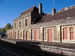 The station was built by Messrs Baker & Son of Canon's Marsh, Bristol.[2] The buildings, constructed in a Gothic Revival style, cost £20,000, with the main buildings on the northern platform. There was a large booking hall with sizeable fireplaces at each end. Pointed ground floor doorways gave access to the hall, which was adjacent to the booking offices and waiting rooms. It is believed that the station master's lodgings in this building were never used as such. A wide carriage drive led down to the northern platform, which was linked to the southern platform by a glass-covered footbridge. There was originally no waiting room on the southern platform, but one was built in October 1898. The platforms were mostly covered by "ridge and furrow" glass roofs, supported by iron columns. The station was flooded in August 1883, which resulted in the installation of extra drainage. There was a large goods yard to the south of the platforms, accessed from the west, with a 28-lever signal box at the west end of the southern platform.[1]