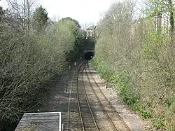 The Clifton Extension Railway was opened from Narroways Hill Junction to Clifton Down as a joint venture between the Great Western Railway and Midland Railway to connect their main lines to the Bristol Port Railway and Pier in the Avon Gorge.[1] Clifton Down railway station opened on 1 October 1874, when passenger services began, and was for a while the terminal station. It was the second station along the line from Narroways Hill Junction where the Extension Railway left the Bristol and South Wales Union Railway's main line to Wales. It remained the second station until Redland was opened in 1897.[1] The line was built at 4 ft 8+1⁄2 in (1,435 mm) standard gauge.[2]