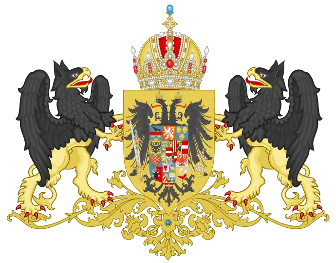 ![]() | 1915–1918[1] | Medium common Coat of Arms | Medium Coat of arms of Cisleithania and Transleithania (see below) with supporters: a griffin in the dexter (for Austria) and an angel (for Hungary) in the sinister. |