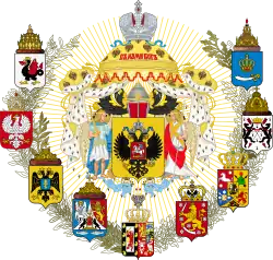 Around the central composition are placed fifteen coats of arms of the various territories of the Russian Empire. Nine of these are crowned and placed on a laurel and oak wreath. Proceeding from the left in a counter-clockwise direction, these represent, as they are included in the full imperial title: the Khanate of Kazan, the Congress Kingdom of Poland, Tauric Chersonesos, the unified coat of arms of the Grand Principalities of Kiev, Vladimir and Novgorod, the dynastic arms of the House of Holstein-Gottorp-Romanov, the Grand Duchy of Finland, the Georgian principalities, and the Khanates of Siberia and Astrakhan.