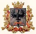 The coat of arms of the Yakutsk Oblast was approved on 5 July 1878. The coat of arms consisted of silver shield, with a black eagle holding a scarlet sable in its claws. The shield is decorated with the Tsar's crown and is surrounded by golden oak leaves, intertwined by Alexander's ribbon.[5]