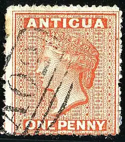 The Post Office Act of Antigua, passed on 24 April 1860, by the Assembly of the Leeward Islands, transferred control to the local government. The first order for stamps was for a sixpence denomination to be used for the letter rate from Antigua to Great Britain. A consignment of 8,000 stamps, was sent out on 1 July 1862, by the printers, Messrs Perkins Bacon and Co. These arrived and were issued sometime in August 1862. A one penny stamp was issued in 1863. The design of these stamps is based on a drawing of Queen Victoria's head by Edward Henry Corbould and was engraved by Charles Henry Jeens.[1] The plates from which Messrs Perkins Bacon and Co had printed all the Antiguan stamps up to that date were handed over to the new contractors for the colony, Messrs De la Rue and Co on 23 November 1871.