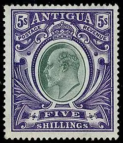 At a meeting on 29 June 1903 the Executive Council of the Leeward Islands authorised separate issue for each of the islands to be used concurrently with those of the Leeward Islands. Ten values, from ½d to 2s 6d, showing the Royal Arms and the Seal of Antigua and a 5s showing the head of King Edward VII were issued in July 1903.[1]