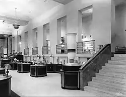 Although the new owners had originally agreed to preserve the Seventh Floor, they eventually determined that its preservation and restoration was not financially feasible. They applied for a demolition permit to convert the entire floor to office accommodation. After a lengthy court battle with the City of Toronto, the Court of Appeal for Ontario ruled in 1986 that the 1975 designation of the building under the Ontario Heritage Act protected the Seventh Floor from demolition.[6] Despite several changes in building ownership, and the efforts of local heritage advocates, the Seventh Floor was sealed off for many years and allowed to deteriorate. Although it was protected by law, owners had no legal obligation to use or restore it. After an extensive renovation program to restore the original art deco architecture, the space reopened in 2003 as The Carlu, an event and convention venue.