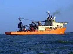 A pipelay barge, or lay barge, is used to lay submarine pipelines by welding pipe sections to the pipeline on board, inspecting and coating the joint, and lowering the assembled part to the seabed over a projecting supporting structure called a stinger which guides the pipe and controls the curve at the end of the barge (overbend) in a more or less continuous process. As the pipe approaches the seabed, the pipe takes a convex-downward curve (the sagbend) before making contact with the bottom. the sagbend is controlled by tension applied from the vessel and tension wires from the pipeline on the bottom to anchors which prevent it from being dragged out of position by the barge.[6]