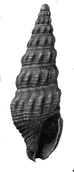 (Original description) A slender shell of medium size containing about nine whorls. The apex is decorticated, but apparently the smooth papillate initial whorl is succeeded by a little more than half a whorl, on which the sculpture is limited to a medial and a stronger anterior spiral. The remaining whorls are both axially and spirally adorned. The aial ribs number 13 on the later whorls. These are narrow, rounded, undulating the whorls from the anal fasciole to the anterior suture. but evanescent on the columella. The spiral sculpture is elaborate. The primaries are low, flat bands about 0.2 millimeter in breadth, somewhat irregularly spaced. There are 4 or 5 on the whorls of the spire, twice as many on the body whorl. The 10 lirations on the columella are narrower and more prominent. Between the primaries 1 or 2 secondaries are similar to the former in general character and separated from them and from each other by linear interspaces. They are lacking on the columella and near the apex. The anal fasciole is concave, sculptured with 5 to 7 crowded lirae, which become most prominent directly in front of the suture. The sinus is deep, rather narrow, and is set a little nearer to the periphery than to the posterior suture. The aperture is narrow, ovate and terminates in a short emarginate siphonal canal.[1]