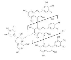 Condensed tannins (proanthocyanidins, polyflavonoid tannins, catechol-type tannins, pyrocatecollic type tannins, non-hydrolyzable tannins or flavolans) are polymers formed by the condensation of flavans. They do not contain sugar residues.[1]