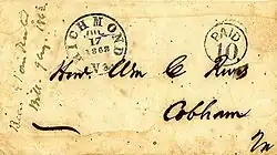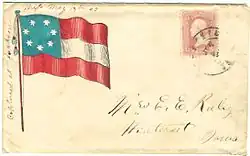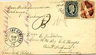 A considerable number of Confederate covers (i.e. stamped - addressed envelope) survived the Civil War and through the many years since they were mailed and have been avidly sought after and preserved by historians and collectors alike. The war had divided family members and friends across the country, and letter writing naturally increased dramatically, especially to and from the men who were away serving in an army. Letters written by soldiers reveal how they would frequently ask parents, wives and family members to write often and to also ask others to write letters back to them. As mail sent to and from the soldiers became more commonplace in the mail streams of the divided states, various Christian charity groups provided pens, paper and envelopes for the soldiers in response to their constant need for these items, since soldiers on active duty during wartime rarely had the opportunity to buy these things. The variety of mail from this time period provides the student of Civil War history with an excellent cross-reference of the history involved then.[14] Special categories of interest include covers to and from soldiers, patriotic covers, prisoner-of-war covers, Flag of Truce and through-the-lines mail, mail carried by blockade runners to and from Europe, and a variety of other types. All of these specialties have been intensively studied. Although contemporary official records are often fragmentary or missing, and many details remain unclear, the covers with their addresses, dated postmarks, special markings and the letters themselves have provided much insight for historians and collectors in their studies of Civil War postal history. Some forging of material went on in the late 19th century, and authentication is a challenge for experts. As a rule of thumb a collector should be wary of fancy cancels on Confederate mail, as the C.S.A. Post Office never used fancy cancels. Other common types of forgeries include added stamps to a cover and forged postmarks. Another common oversight of the forger is postmarking stamps with dates before the stamp was issued.[15] Many collectors over the years have marked or destroyed fakes and forgeries upon identification in an effort to keep the collecting pool safe from such material. This is a practice common to most of philately.[16]