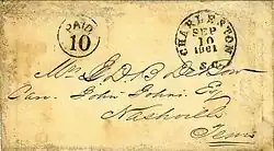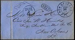 When the Civil War got underway, both sides were ill-prepared to deal with the very large numbers of captured troops. For a time a prisoner and mail exchange program was in use that lasted until June 1863, when the U.S. government terminated any further cooperation due to mounting war tensions and increased mistrust.[19] The postmarks and stampings found on wartime mail from military prisons and camps during the war are sought after by historians and collectors, not only for their souvenir value but also as confirmation that various people, events and places existed at the time of mailing indicated by the name, address, postmark and other official markings. The mailed covers often bear the postmark of the nearest town or city from where the prison or camp was located. The study of Civil War military postal history and postmarks is an area of philately that involves a great volume of material covering town names, history, rarity, postmarks, and other official markings found on mail to and from POW facilities. In the navigation boxes below are two partial lists of some of the larger prison facilities, Union and Confederate, in operation during some or all of the war. Numbers for inmate totals are included to provide insight into knowing the amount of any surviving mail that is or may be in existence. There were also prison facilities that contained much smaller numbers of prisoners (a couple listed here) also. Records for some prison facilities are completely lacking, the total numbers of prisoners held, peak prison population amounts, escapes and deaths remaining unknown at the present time. Surviving prisoner of war mail to or from some of these places is exceedingly rare, and in some cases no covers are known to exist.[20]