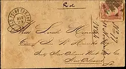 The principal transfer points for mail arriving from or destined to Europe and other locations were Nassau in the Bahamas, Bermuda, and Cuba. Ships carrying letters that were addressed to points in the Confederacy would deposit their cargo of mail at one of these transfer points. Here the inbound mail was handled by a forwarding agent who would remove the mail or inner cover and prepare it for transfer on a blockade runner. Often the forwarding agents would apply their own markings to the cover of mail. Mail placed aboard a blockade runner would then, perhaps with some luck, make its way to the ports of New Orleans, Charleston, or Wilmington, where it was received by Confederate postal operators who would then include it in with the regular Confederate mail for delivery. The captain of the blockade runner would typically get two cents for every letter he delivered to port, which was a nominal sum, as his main source of revenue was from delivering his cargo. The average number of successful runs by a blockade runner was only about four, many of them meeting a fateful ending on their first run. Various ports along the coastline of the Confederacy saw the most traffic from blockade runners. Charleston in South Carolina was particularly well situated as a port for blockade runners with their shallow drafts, as was the Port in Wilmington in North Carolina which saw the most traffic. Because the lower Mississippi River was being blockaded effectively dividing the Western Confederate states from those east, New Orleans became one of the busiest of ports. Consequently, many blockade covers have postmarks from these locations.[22][25]