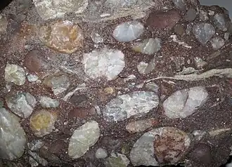 Two recognized types of intraformational conglomerates are shale-pebble and flat-pebble conglomerates.[6] A shale-pebble conglomerate is a conglomerate that is composed largely of clasts of rounded mud chips and pebbles held together by clay minerals and created by erosion within environments such as within a river channel or along a lake margin.[7] Flat-pebble conglomerates (edgewise conglomerates) are conglomerates that consist of relatively flat clasts of lime mud created by either storms or tsunami eroding a shallow sea bottom or tidal currents eroding tidal flats along a shoreline.[8]