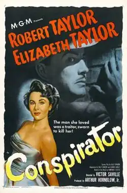 Conspirator is a 1949 British film noir, suspense, espionage, and thriller film directed by Victor Saville and starring Robert Taylor and Elizabeth Taylor. Based on the 1948 novel Conspirator by Humphrey Slater, the film is about a beautiful 18-year-old American woman who meets and falls in love with one of a British Guards, an officer who turns out to be a spy for the Soviet Union. After they are married, she discovers his true identity and forces him to choose between his marriage and his ideology. When his Soviet handlers order him to murder his young American wife, he is faced with the ultimate choice. The film was made for distribution by Metro-Goldwyn-Mayer.