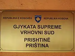 The Constitution of Kosovo (Albanian: Kushtetuta e Kosovës, Serbian: Устав Косовa / Ustav Kosova) is the supreme law (article 16) of the Republic of Kosovo, a territory of unresolved political status. Article four of the constitution establishes the rules and separate powers of the three branches of the government. The unicameral Assembly of the Republic exercises the legislative power, the executive branch led by the president and the prime minister which are responsible for implementing laws and the judicial system headed by the Supreme Court.[1]