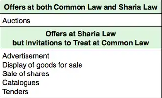 At common law, auctions, advertisements, displays of goods on shelves, tenders and the like are treated as mere invitations to create an offer. In contrast, Sharia law recognises these as valid offers (Ijab) which, upon being accepted (Qabul), will become binding by law upon the parties involved in the transaction.[15]