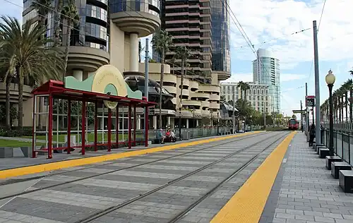 Convention Center station is a station of the Green and Silver Lines on the San Diego Trolley. It is located in the Marina district section of the city, which features a variety of waterfront apartments just west of downtown. The San Diego Convention Center is located adjacent to the station, and Petco Park is less than half a mile away. This station opened June 30, 1990 as part of the Orange Line's (then called the East Line) Bayside Extension.[2]