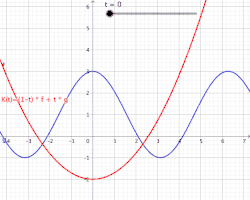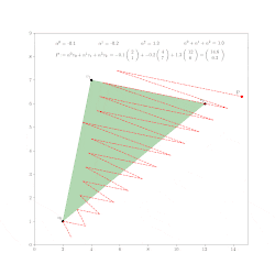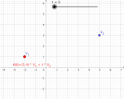 Given three points in a plane as shown in the figure, the point is a convex combination of the three points, while is not. ( is however an affine combination of the three points, as their affine hull is the entire plane.)Convex combination of two points in a two dimensional vector space as animation in Geogebra with and Convex combination of three points in a two dimensional vector space as shown in animation with , . When P is inside of the triangle . Otherwise, when P is outside of the triangle, at least one of the is negative. Convex combination of four points in a three dimensional vector space as animation in Geogebra with and . When P is inside of the tetrahedron . Otherwise, when P is outside of the tetrahedron, at least one of the is negative.Convex combination of two functions as vectors in a vector space of functions - visualized in Open Source Geogebra with and as the first function a polynomial is defined. A trigonometric function was chosen as the second function. The figure illustrates the convex combination of and as graph in red color.