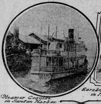 On September 16, 1909, a rival boat, the motor vessel Wolverine collided with Coquille, at Johnson's Mill.[7] No damage was sustained by either vessel.[7]