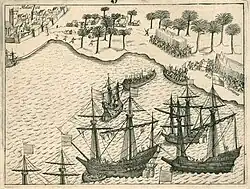 Matelief laid siege to the Portuguese-held Malacca for several months,[5] but was repulsed on land by Portuguese troops under André Furtado de Mendonça and their allies, a contingent of Japanese samurai from Red seal ships. A very large Portuguese fleet under Dom Martim Afonso de Castro, the Viceroy of Goa, arrived on the scene with twenty Portuguese ships on 14 August 1606.