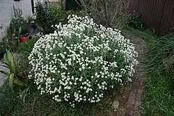The plant is a woody shrub or subshrub with an erect habit reaching anywhere from 0.6 to 2 m (2.0 to 6.6 ft) high.[2] The ovate to elliptic leaves are up to 12 cm (4.7 in) long with entire or wavy (sinuate) margins, and sit on 1–2 cm long petioles. The petioles and leaf undersides are covered in white hair, the upper leaf surfaces less so.[3] The flowers appear from June to November, with plants most floriferous in September.[2] The disc is yellow and bracts are white, the flower heads 2.5 to 4.5 cm (0.98 to 1.77 in) in diameter.[4]