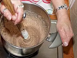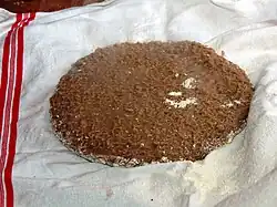 Several cakes are prepared for feasts and special occasions, and some are characteristic of one town or village: Strenna (a pie made with flour and sdruttu dough and a brocciu filling) is prepared in Vico for New Year's Day, panzarotti (beignets made with flour, rice and yeast) are prepared in Bastia for Saint Joseph's Day (19 March),[90] panette for All Saints' Day (1 November), pan di i morti (also named uga siccati, small breads made with flour, yeast, sugar, butter, eggs, raisins and walnuts) for All Souls' Day (2 November) in Bonifacio,[91] canestri (donuts made with flour, butter, eggs and sugar) [92] and campanili (donuts made with flour, yeast, egg, shortening, raisins soaked in aquavita and sugar, decorated with boiled eggs) [92] at Easter, sciacci (the sweet version of these fritters, stuffed with brocciu, and traditionally cooked on a hot granite stone named teghja) are prepared in Sartène at Easter and during sheep shearing, in May.[93] Inuliata, prepared in Ajaccio during the Holy Week, is a yeast cake having flour, powdered sugar, olive oil and wine as ingredients.[86] Fritelli, eaten at Maundy Thursday in Calenzana,[13] are wheat or chestnut flour fritters.[94]